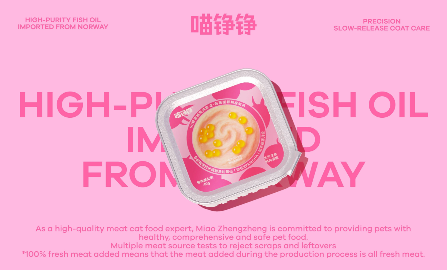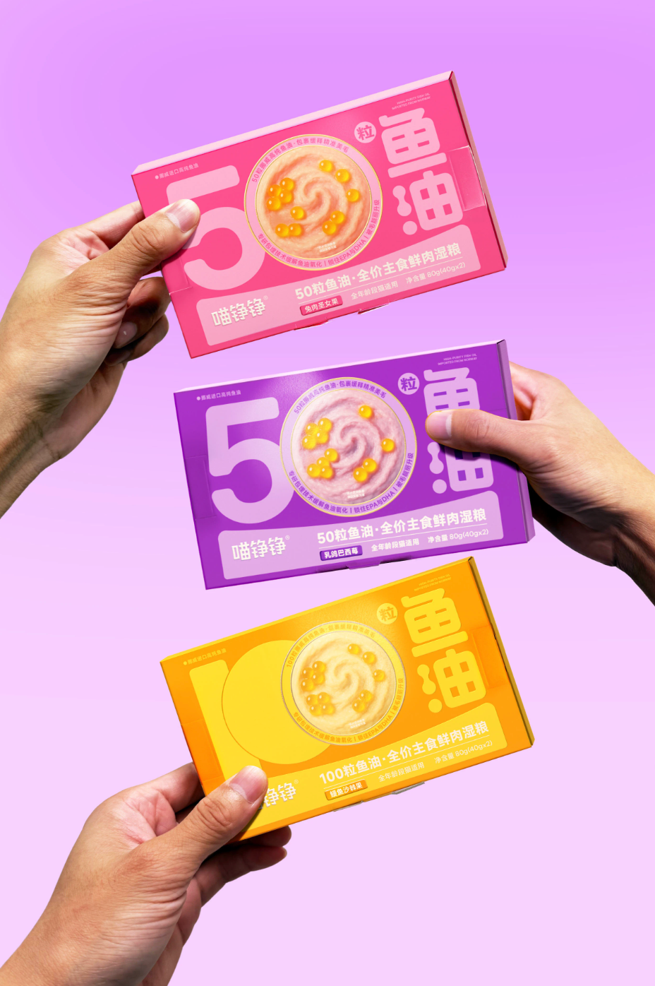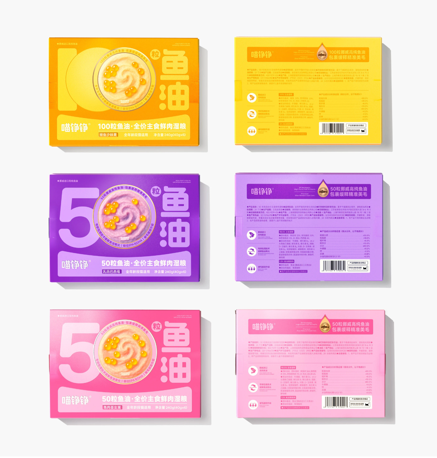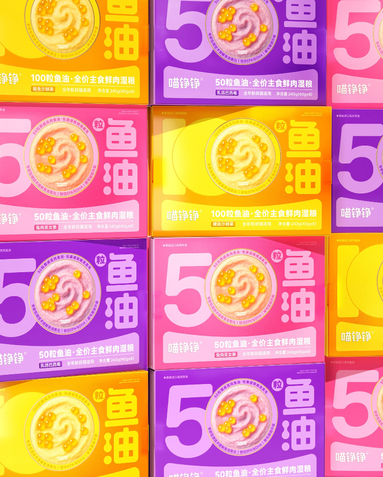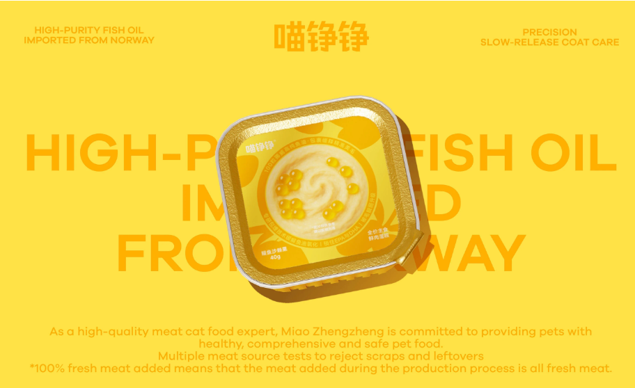 As part of the OnWhite Design team, we redesigned the product packaging for Miao Zheng Zheng's new Fish Oil Bobo launch: 50 Fish Oil Capsules · Complete Fresh Meat Wet Food.